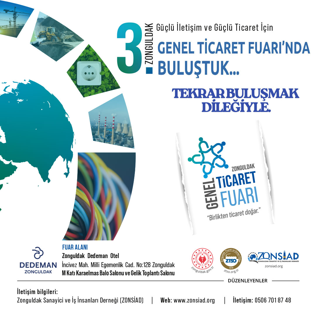 Zonguldak Valiliği, Zonguldak Ticaret ve Sanayi Odası ve Zonguldak Sanayici ve İş İnsanları Derneği (ZONSİAD) öncülüğünde bu yıl 3.’cüsü düzenlenecek Zonguldak Genel Ticaret Fuarı, bu gün Dedeman Otel’de kapılarını misafirlerine açtı. 3. Zonguldak Genel Ticaret Fuarı Zonguldak Sanayici ve İş İnsanları Derneği (ZONSİAD) öncülüğünde, Zonguldak Valiliği ve Zonguldak Ticaret ve Sanayi Odası iş birliğiyle 12-13-14 Eylül 2025 tarihlerinde Dedeman Otel'de start aldı. Zonguldak’ın ekonomik hayatını canlandırmak ve ticari işbirliklerinin sağlanması amacıyla düzenlenen 3. Zonguldak Genel Ticaret Fuarı, bu gün kapılarını misafirlerine açtı. ZONSİAD Başkanı Nejdet Tıskaoğlu, ZTSO Başkanı Metin Demir’in ev sahipliğinde başlayan fuara Zonguldak Valisi Osman Hacıbektaşoğlu, AK Parti Zonguldak Milletvekili Muammer Avcı, Cumhuriyet Halk Partisi Zonguldak Milletvekili Dr. Eylem Ertuğ Ertuğrul, Zonguldak Belediye Başkan Vekili Dr. Atınç Kayınova, Zonguldak İl Emniyet Müdürü Sinan Ergen, Zonguldak İl Jandarma Alay Komutanı J.Kd.Alb.Barış Cücen, CHP Zonguldak İl Başkanı Devrim Dural, MHP İl Başkanı Çağatay İpekçi, Saadet Partisi İl Başkanı Burak Erol. Genel Maden İşçileri Sendikası (GMİS) Genel Teşkilatlandırma ve Eğitim sekreteri Tayfun Demir, Zonguldak İl Tarım ve Orman Müdürü Nihat Ağan, Esnaf ve Sanatkarlar Adası Birliği Başkanı Muharrem Coşkun, Kızılay Derneği Başkanı Kürşat Yağız, ZONDEF Başkanı Ziya Öncan, Sivil Toplum Örgütleri, iş insanları ve misafirler katıldı.
